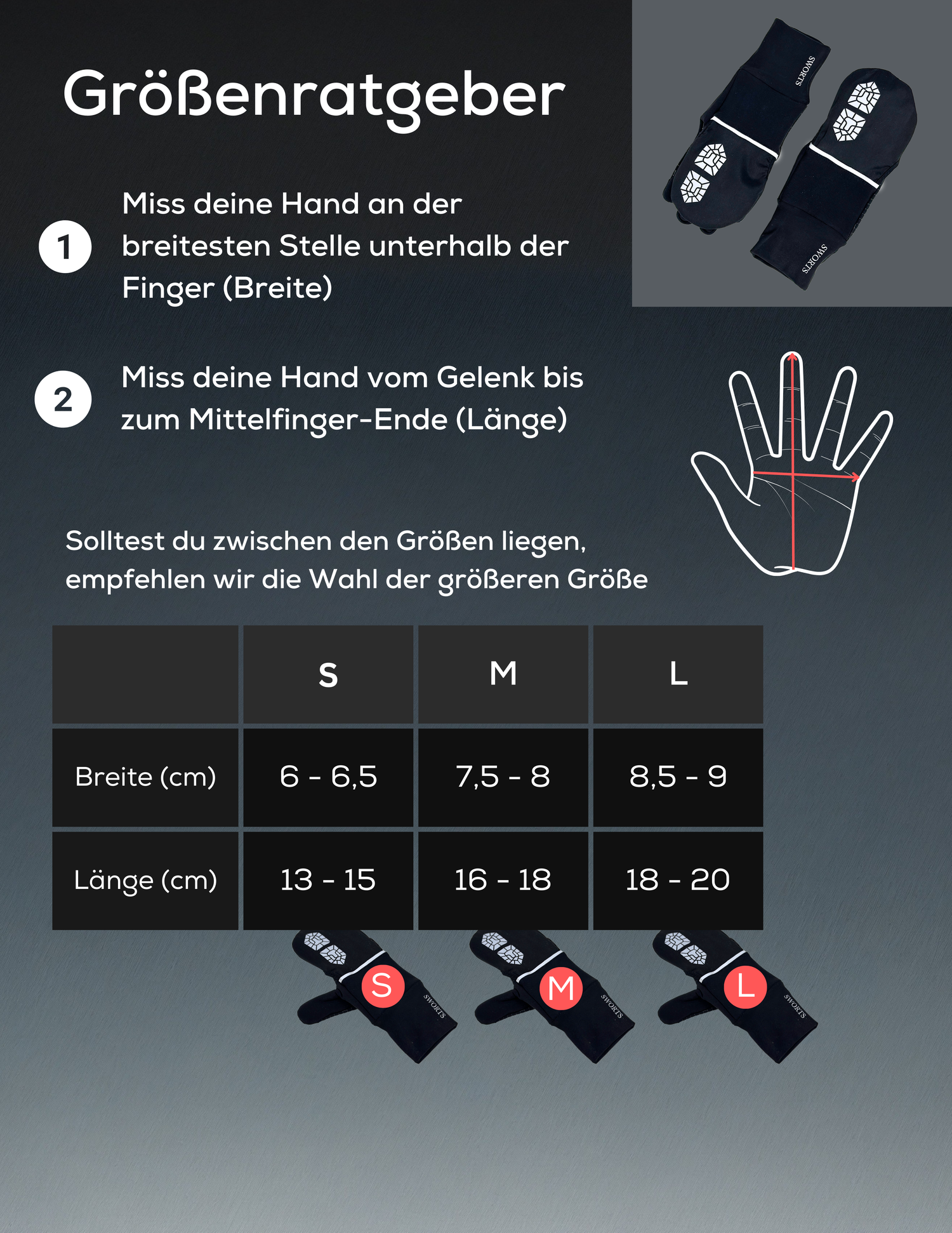 Hier findest du alle notwendigen Informationen zur richtigen Größenwahl. Folge der Anleitung und entscheide dich für deine passenden ThermoCare Gloves.